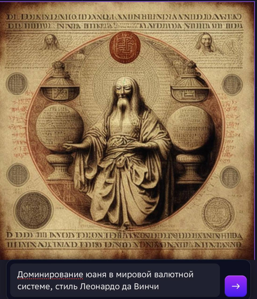 Я, конечно, попросила изобразить доминирование юаня в стиле Леонардо. С первого раза такой вот результат.