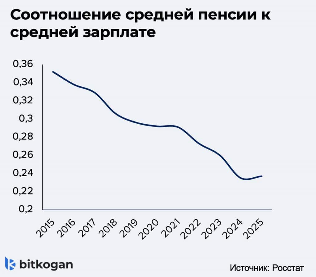 ◽️Вроде бы пенсии растут, но по отношению к средней зарплате они всё это время только снижались — с 35,2% в 2015 до 23,7% сегодня.