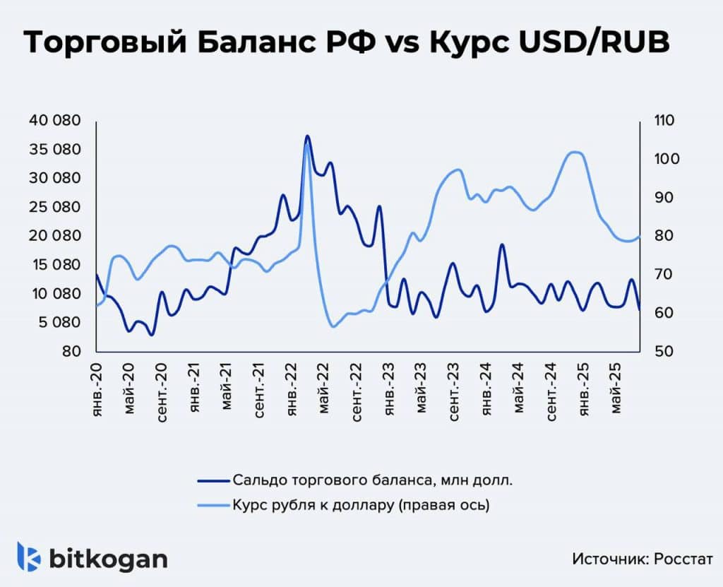 ➡️ Начнем с того, что подобные аномалии уже случались. Так, несмотря на геополитику, в 2022 году доллар снизился до 55 рублей. Правда, не на пустом месте, а потому что импорт из ЕС почти встал, в результате чего спрос на валюту упал, а экспорт, наоборот, шел на рекордных уровнях. Плюс нефть Urals держалась около $85 за баррель. Но продержался крепкий рубль недолго.