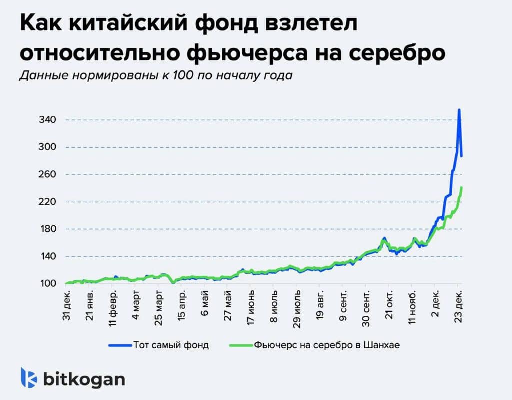◽️Фонд рос слишком быстро. Когда серебро было на 130% дороже, чем в начале года, паи фонда были дороже на 200%. Люди добровольно платили более полутора юаней за каждый юань серебра и считали это отличной сделкой.