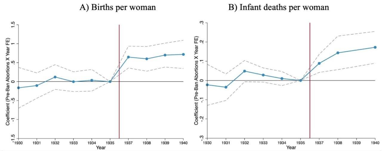 Обратимся к опыту нашей собственной страны. Вышел препринт академической работы (Mehmood, S, Y Prokhorskoy and H Zoabi, 2025), в которой анализируются последствия запрета абортов, введенного в СССР в 1936 году. Исследование использует региональные различия и позволяет количественно оценить эффекты этой меры.